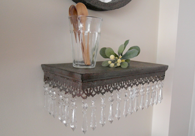 Metal wall shelf with crystal like decor ornament, 2 sizes available. Dimensions: 14″w x 7″d x 5″h or 10″w x 6″d x 5″h